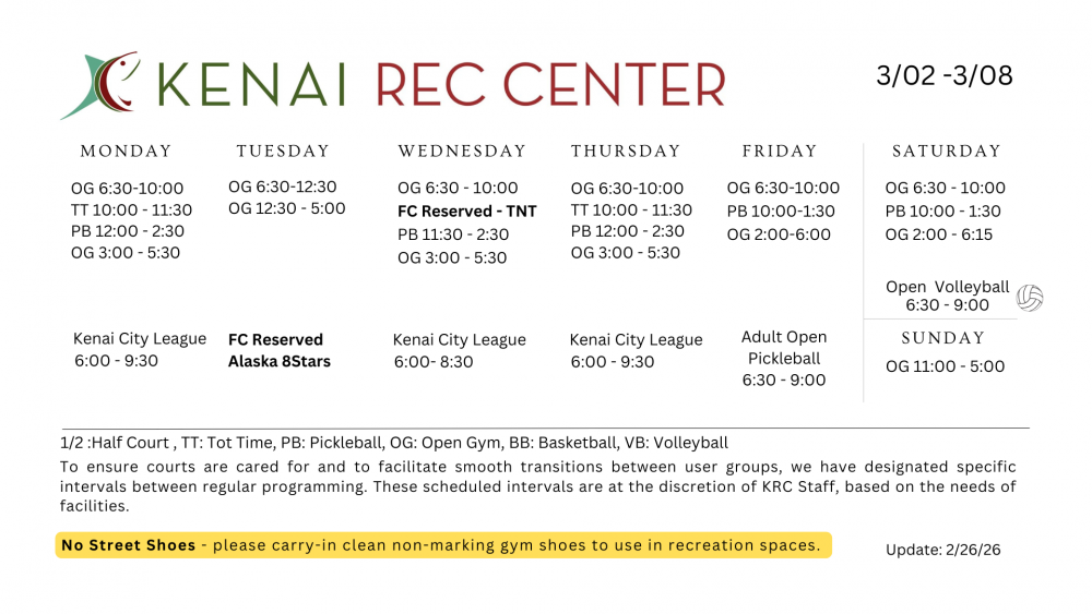 Contact: KRC Front Desk at (907) 283-8265